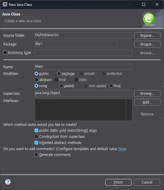 Package, Name 입력, public static void main(String[] ags) 선택 후 Finish