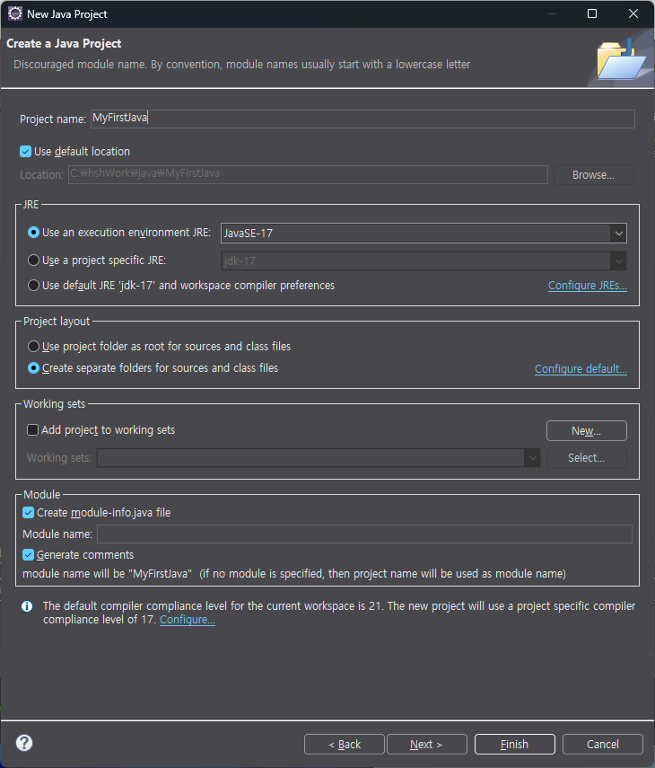 -Dosgi.requiredJavaVersion=21 환경설정한 버전인 17로 변경한다.