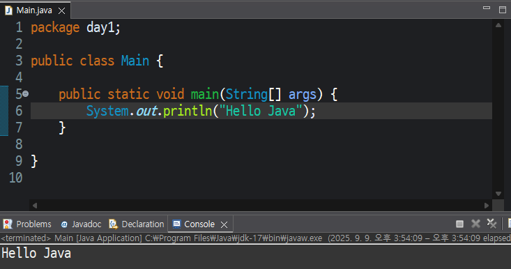 클래스 생성 후 간단한 출력 문구 작성 후 실행 하면 아래와 같이 출력된다.