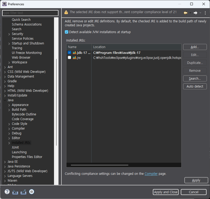 java > Installed JREs > 위에서 설치한 jdk-17버전 설정