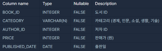 BOOK 테이블은 각 도서의 정보를 담은 테이블로 아래와 같은 구조로 되어있습니다.