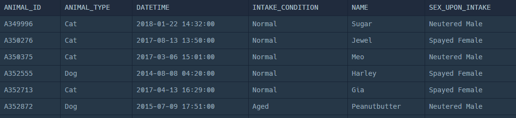 SELECT ANIMAL_ID, ANIMAL_TYPE, DATETIME, INTAKE_CONDITION, NAME, SEX_UPON_INTAKE