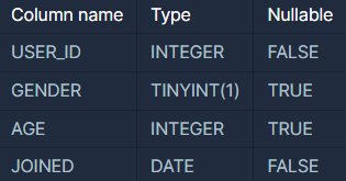 다음은 어느 의류 쇼핑몰에 가입한 회원 정보를 담은 USER_INFO 테이블입니다. USER_INFO 테이블은 아래와 같은 구조로 되어있으며 USER_ID, GENDER, AGE, JOINED는 각각 회원 ID, 성별, 나이, 가입일을 나타냅니다.
