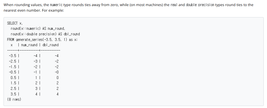 그래서 PosgreSQL에서는 정확한 소수 결과를 얻기 위해서는 numeric 타입으로 캐스팅을 해주는 것이 필요하다.