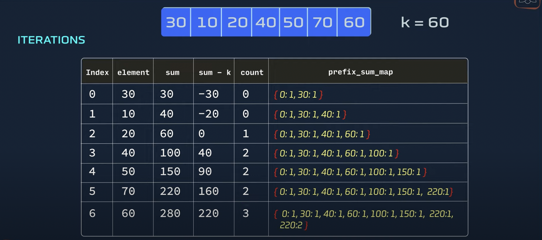 prefixSumMap.set(sum, 1) // 초기값 저장 sum === 0 count + 1