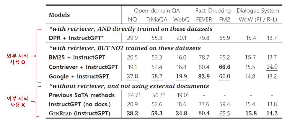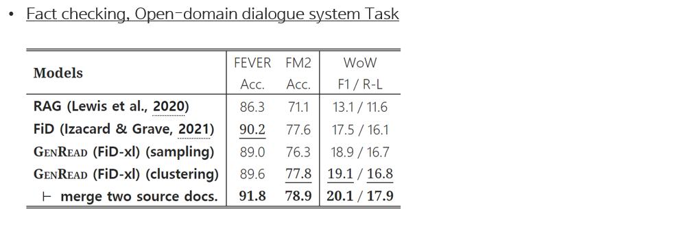 실험 결과, 주목할 점은 논문에서 제시한 GenRead모델이 기존 retrieval-reader model들과 달리 외부 지식 없이도 기존 모델들의 성능을 뛰었다는 점