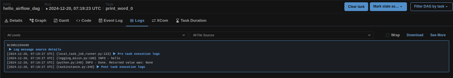 아래 사진과 같이 개별 DAG 누를경우 Logs 메뉴 들어가서 확인 해당되는 출력 확인가능