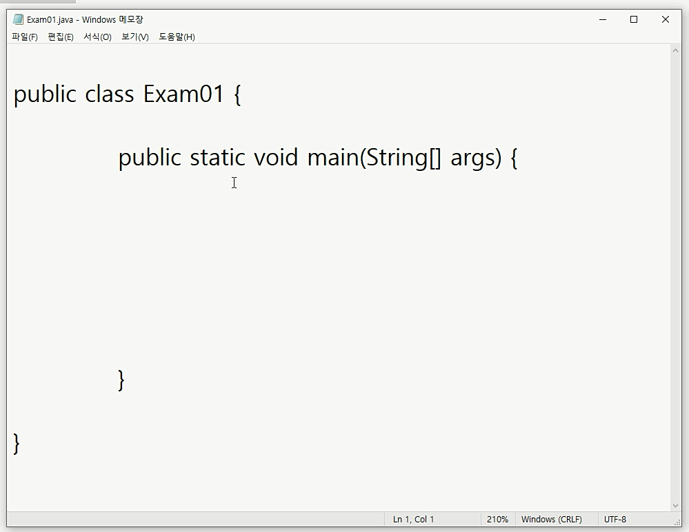 - src 들어가면 : 방금 만든 Exam01.java가 있을 거야. 이걸 메모장에 드래그하면