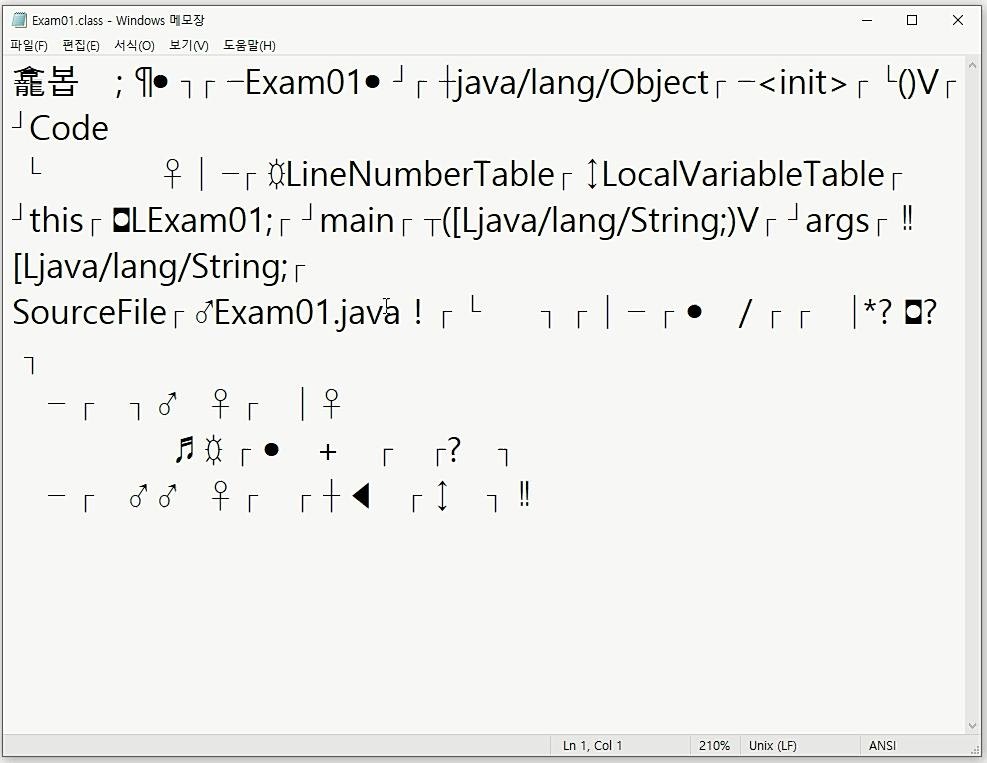 - bin 에 들어가면 : 컴파일된 Exam01.class 파일이 있어 (즉, 우리가 따로 변환하지 않아도 이클립스에서 알아서 컴파일이 진행됨). 이걸 메모장에 드래그하면