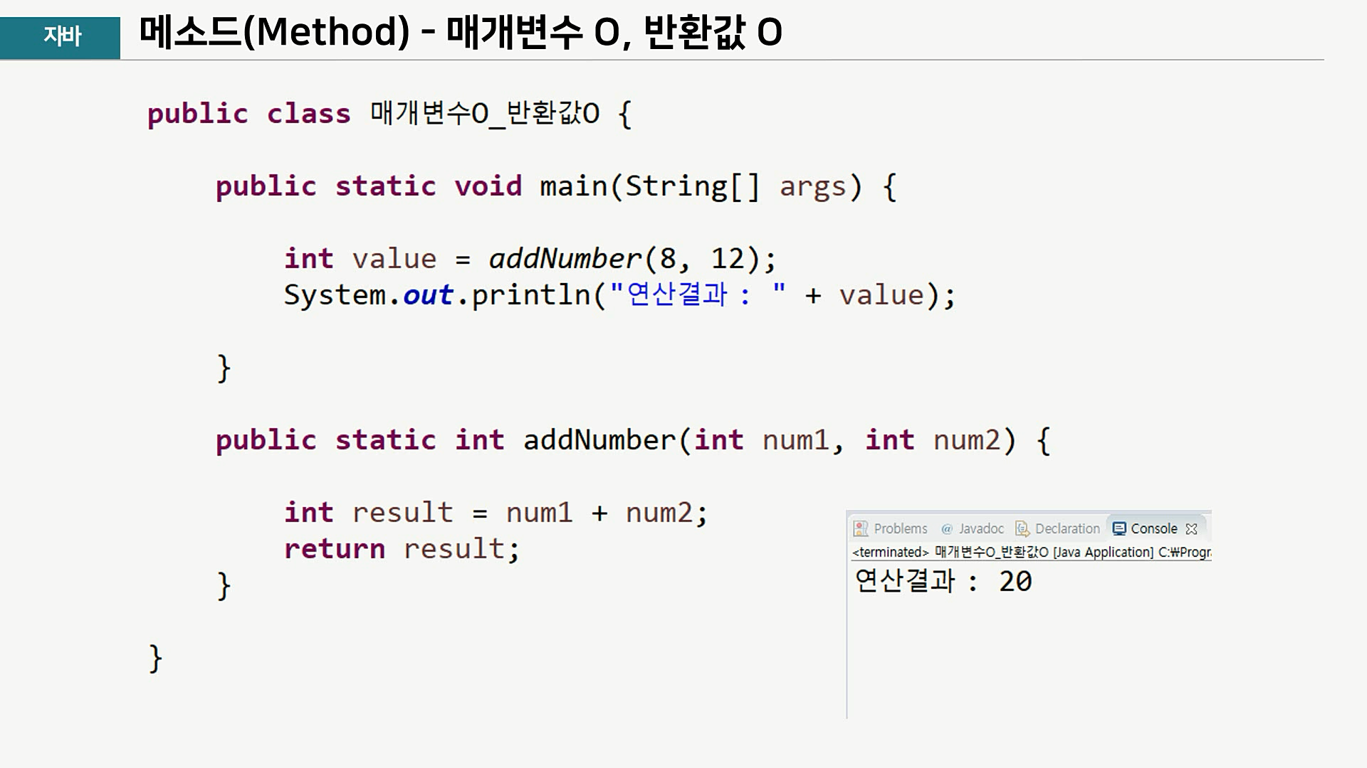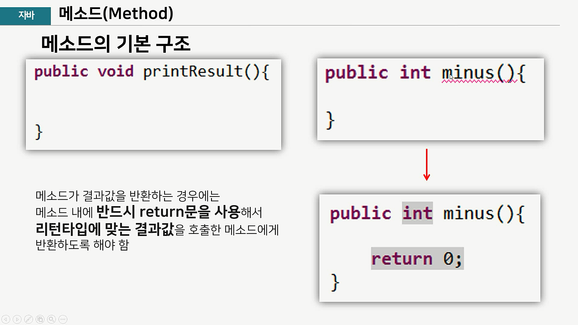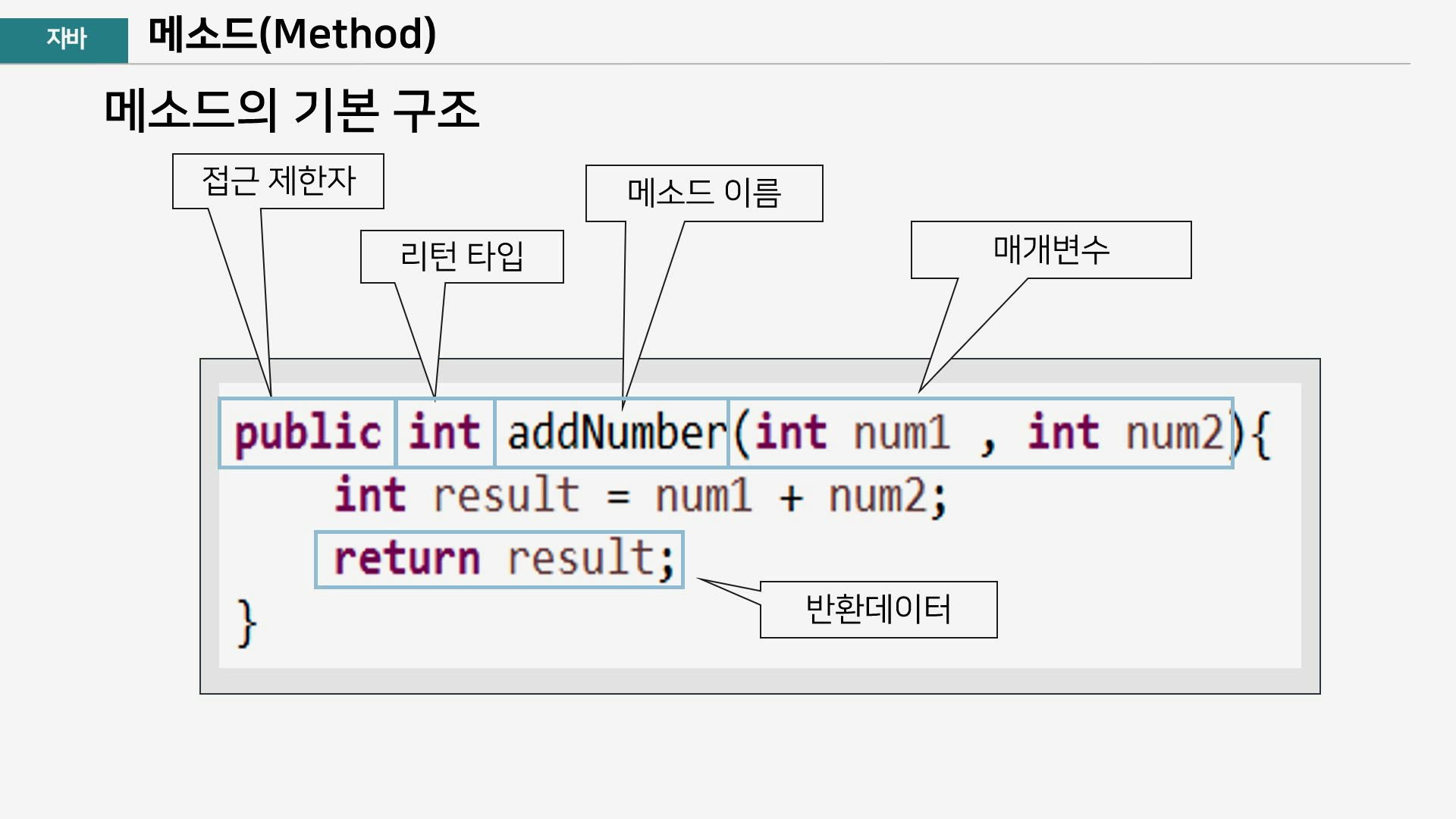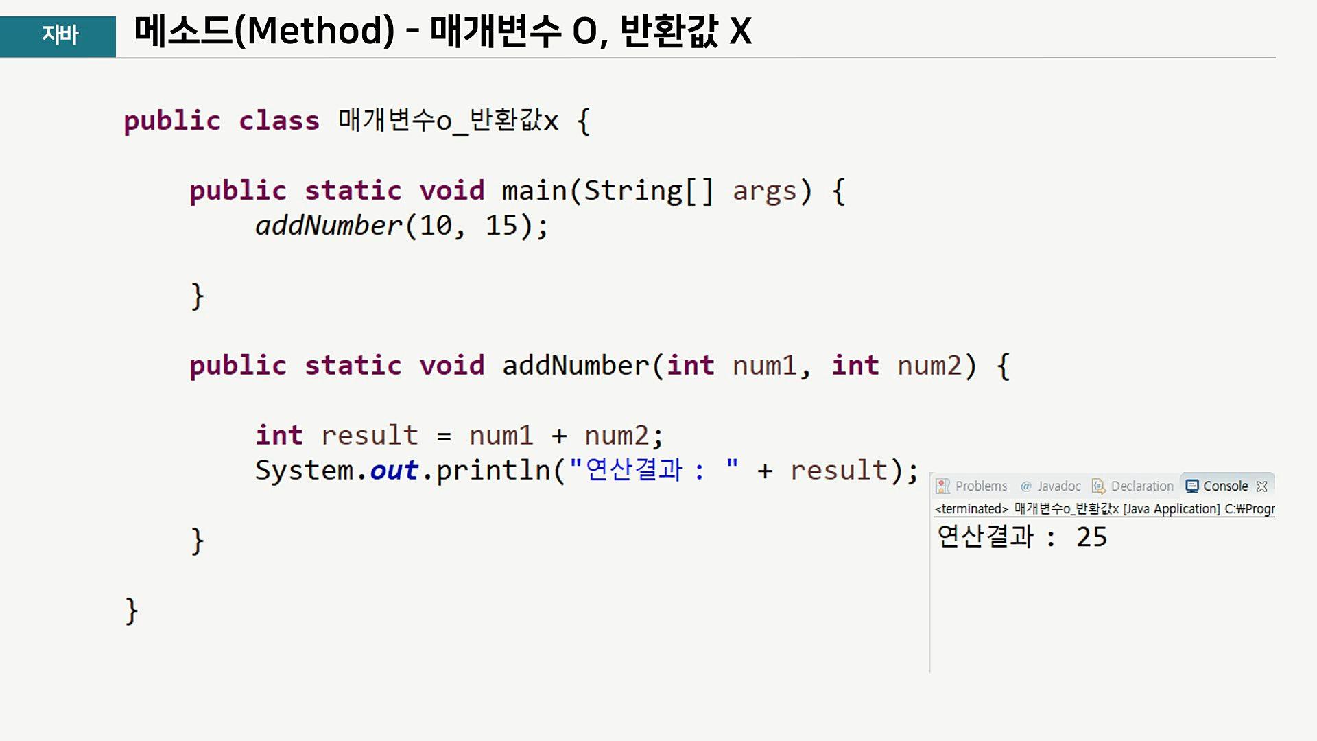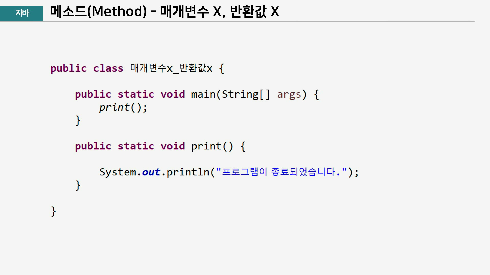 출력되는 게 기본 구조이지만, 결과값을 안 주는 메소드를 만들때는 void를 써줘야 해