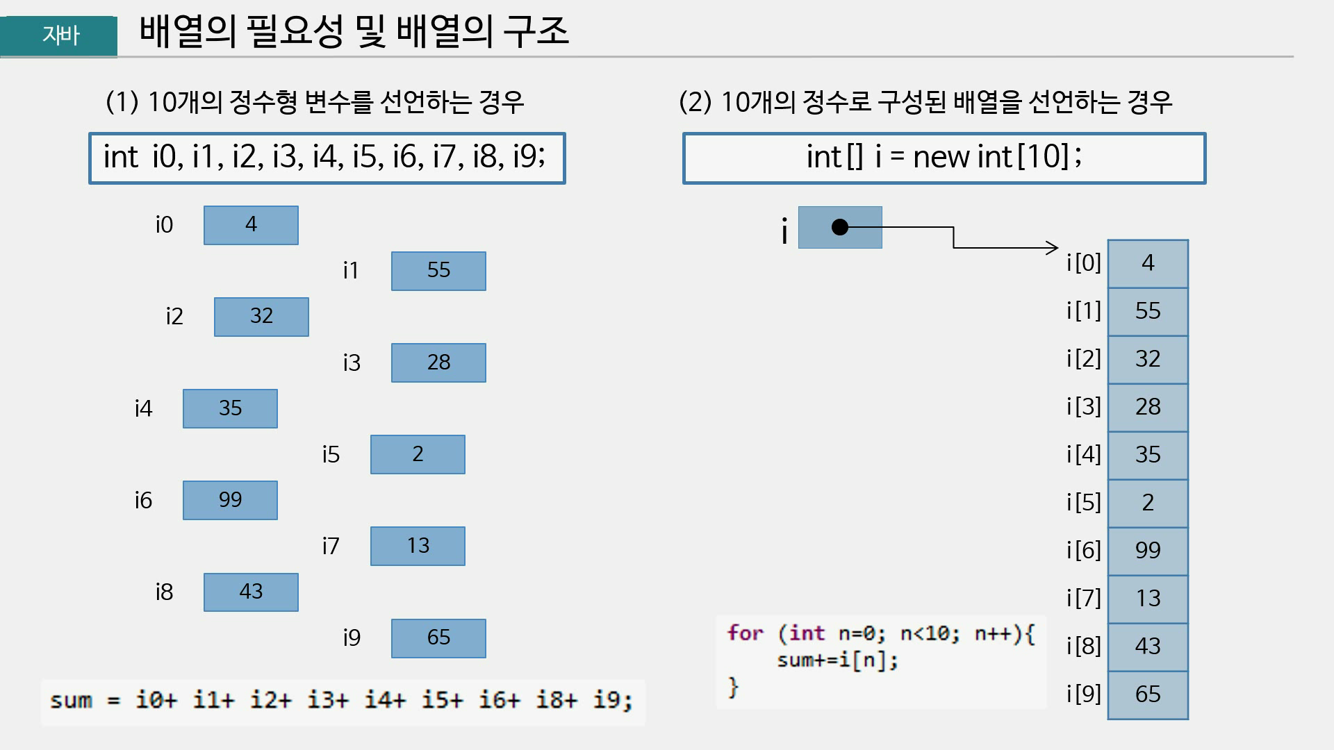 - 자바에서는 배열의 길이 고정. 늘리거나 줄일 수 없어 (파이썬은 가변인데)