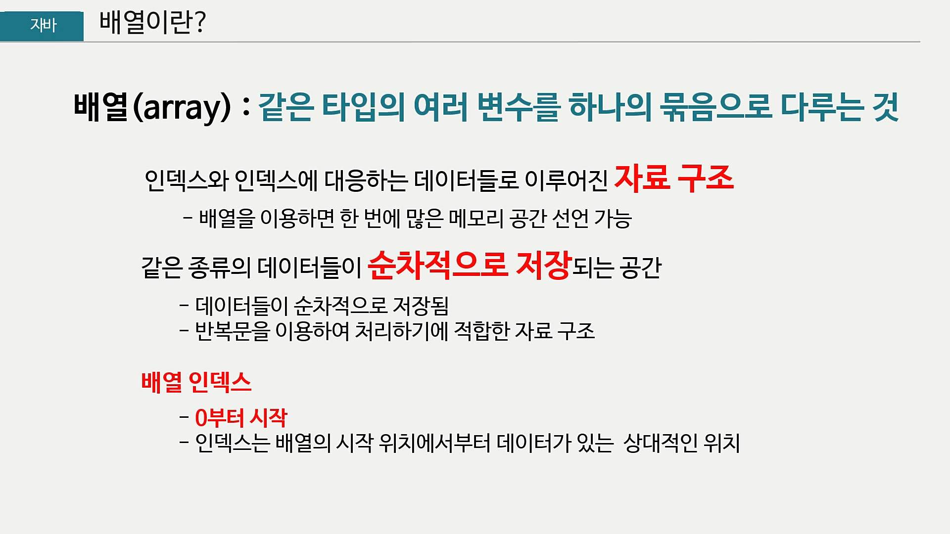 - 배열 인덱스는 0부터 시작