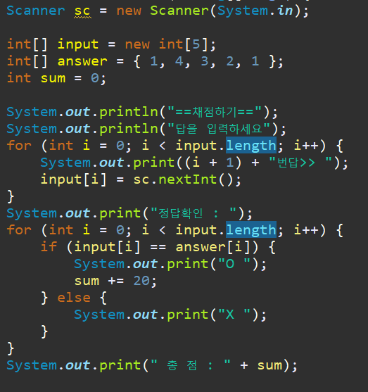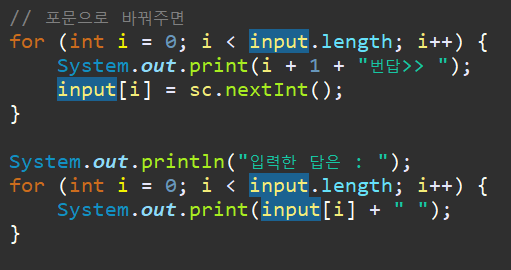 - 입력받은 문자열 인풋이랑 똑같은지 비교할 때는? : 값.equals(비교할값)