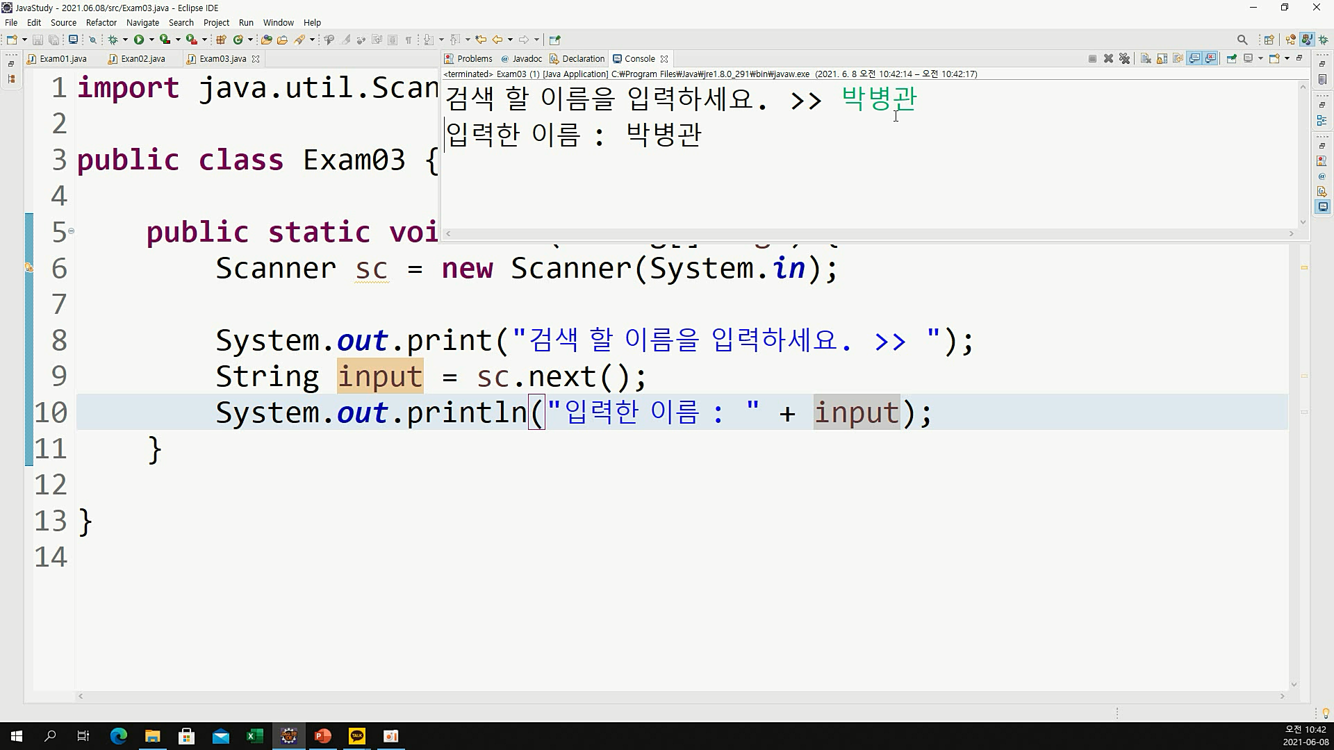 - 내가 입력한 문자가 sc.next(); 에 담기는 것