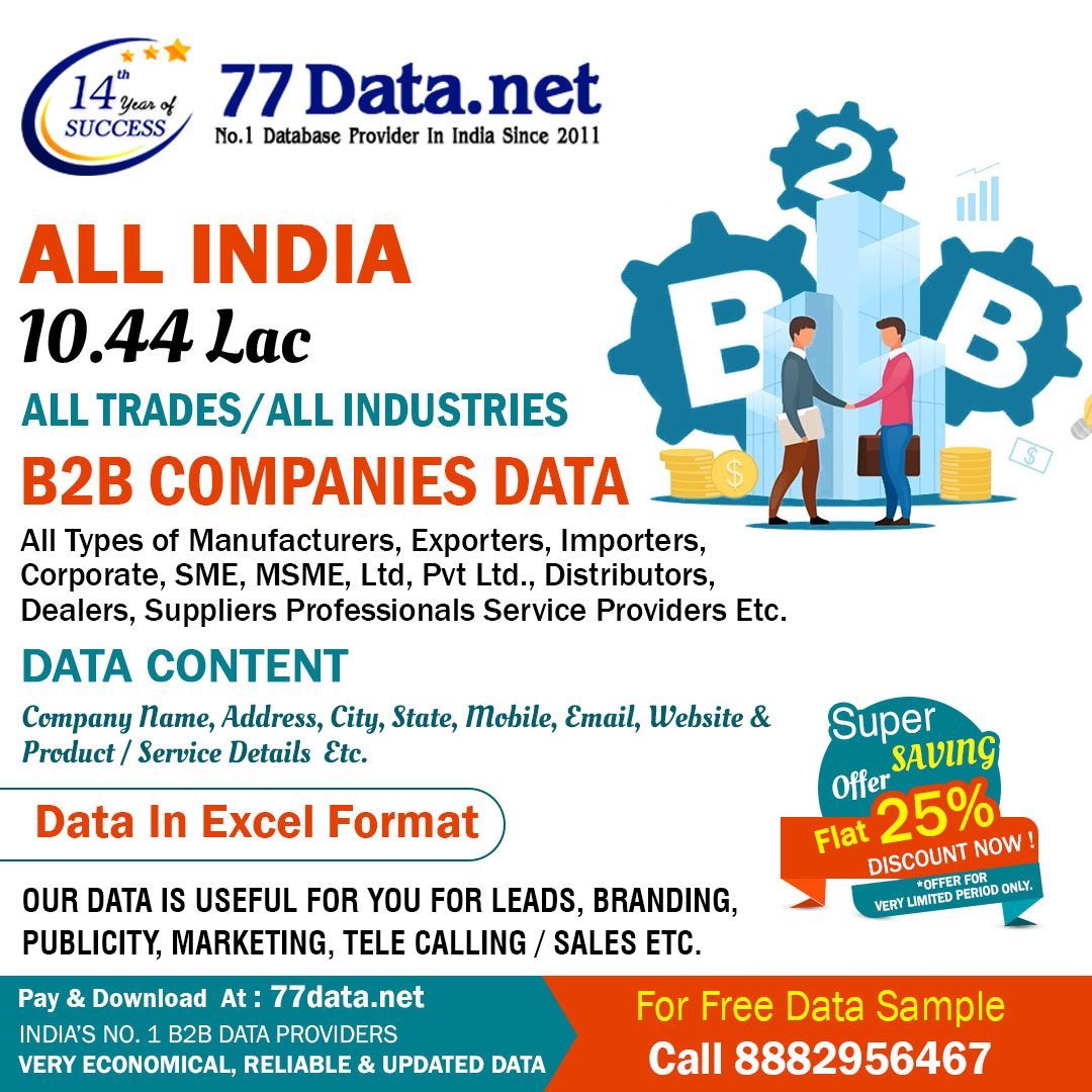 Are you looking for a verified B2B company database? Choose 77Data, which is one of the best B2B database provider companies in India. It provides all industry database cities and state-wise. 77Data provides all India cities and states data with all major details.
