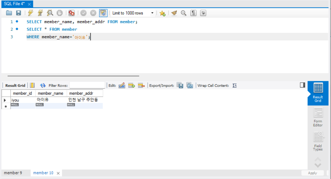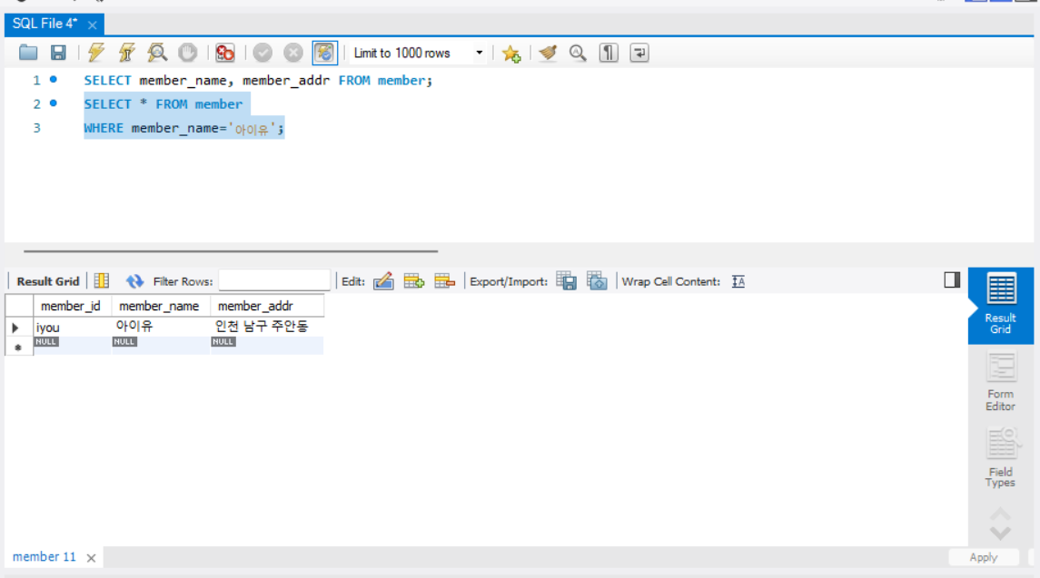 아이유 회원에 대한 모든 정보를 추출해야 됨으로 SELECT *를 활용한다.