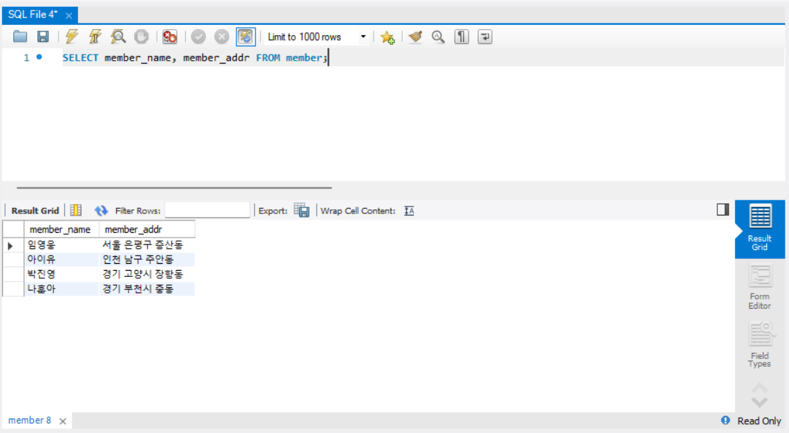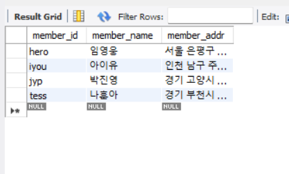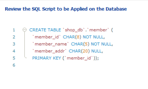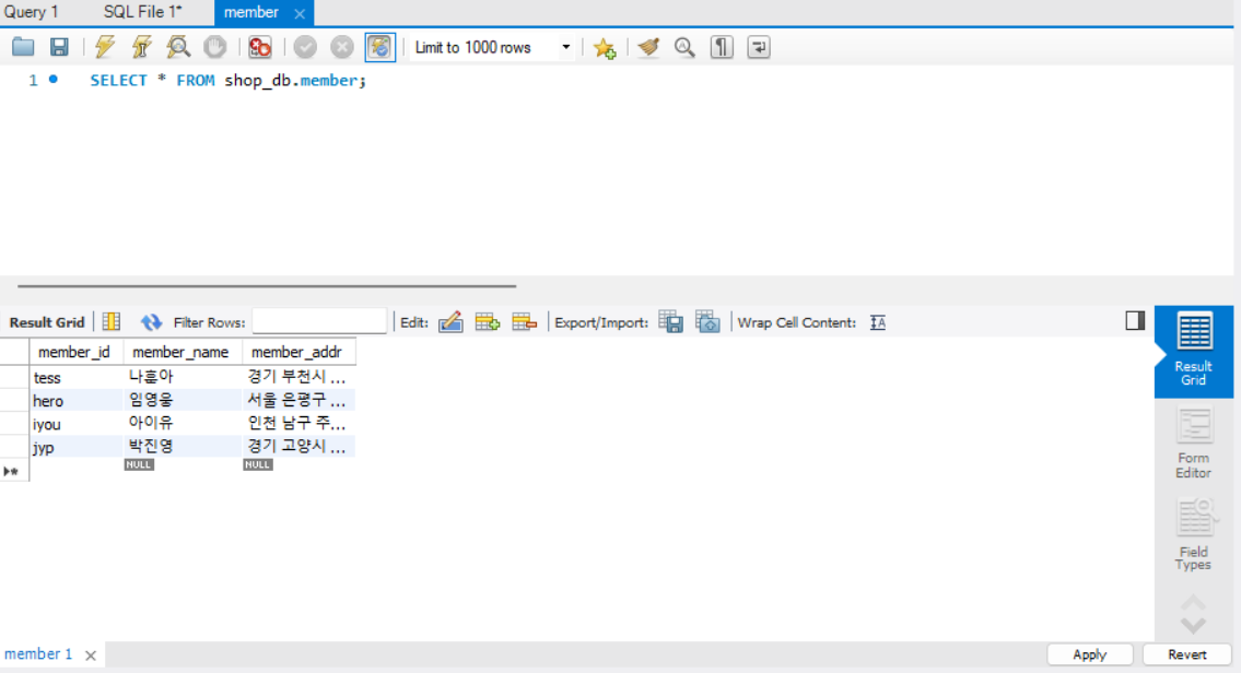 스키마 패널에서 [shop_db]-[Tables]-[member]를 선택하고