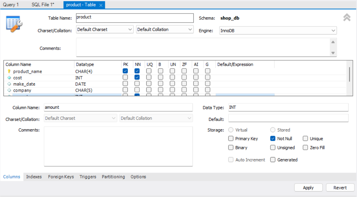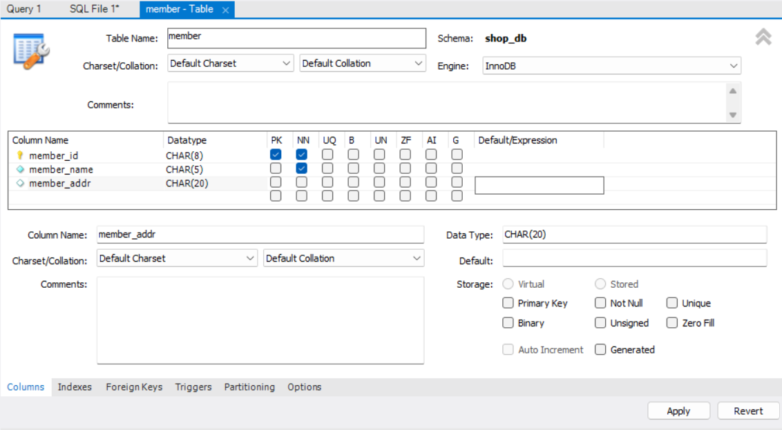 열은 id, name, address 가 있으며 데이터형식과 pk(기본키여부),NN(널허용)을 결정하여 테이블을 만든다.