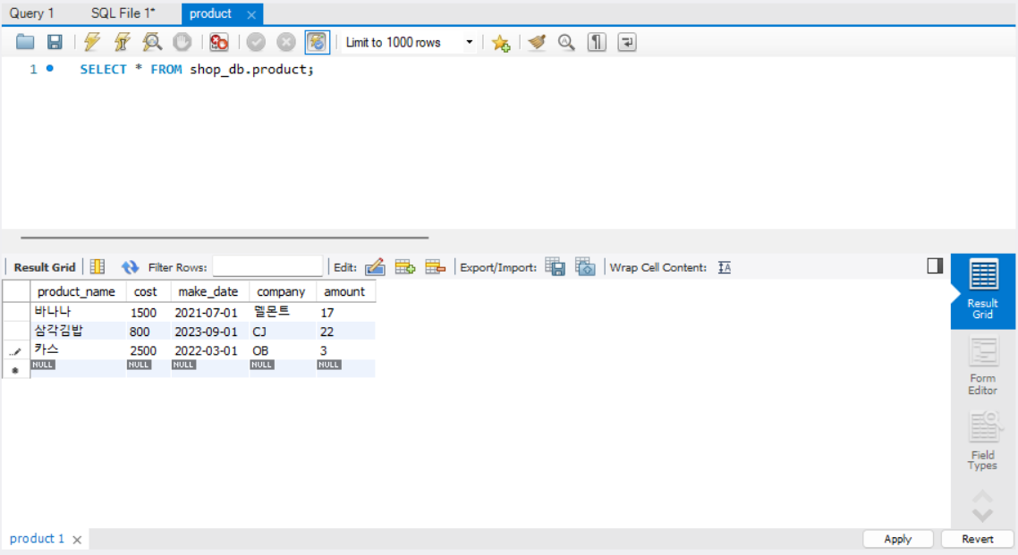 product 테이블도 위와같은 방법으로 데이터를 입력한다.