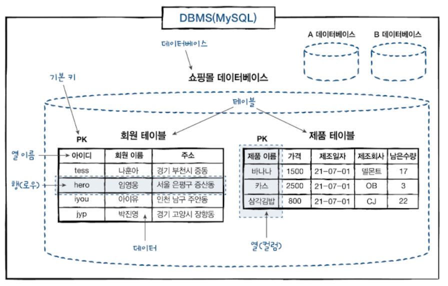 데이터베이스 만들기--> 테이블만들기-->데이터입력/수정/삭제-->데이터 조회/활용