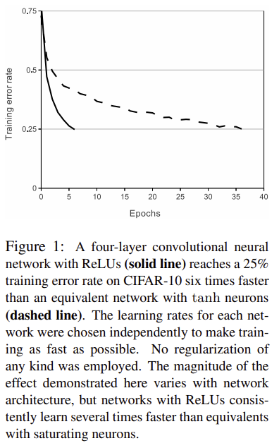 3.1에는 모델에 ReLU를 사용했다는 것이다. 아래 Figure 1에서 볼 수 있듯이 학습이 6배나 빠르다는 것을 볼 수 있다. ReLU는 4개의 CNN에 사용되었다.
