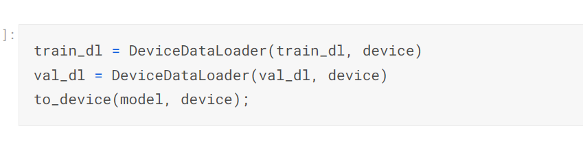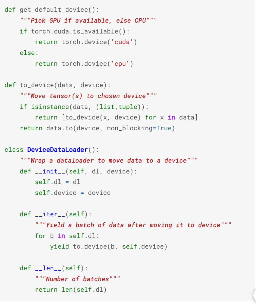 GPU를 원활하게 사용할 수 있는 경우 몇 가지 도우미 기능(get_default_device &to_device)과 도우미 클래스 DeviceDataLoader를 정의하여 필요에 따라 모델과 데이터를 GPU로 이동합니다.