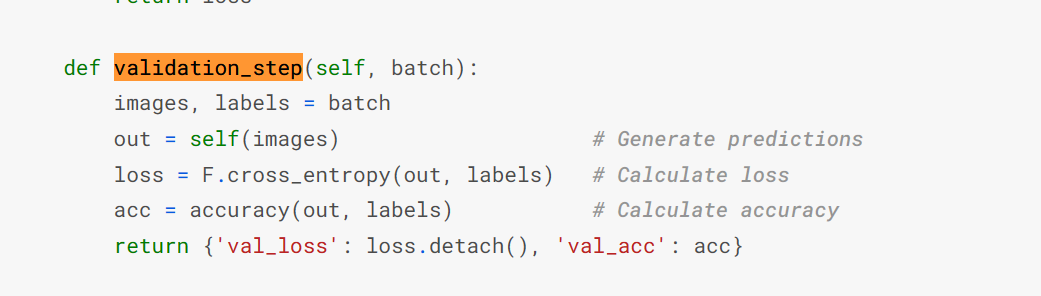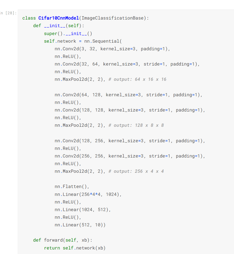 우리는 class Cifar10CnnModel에 종속되어있다고 생각하면된다. 즉 self(images) 는 Cifar10CnnModel.forward 으로 연결되있고 return self.network(xb<- 여기에 images )