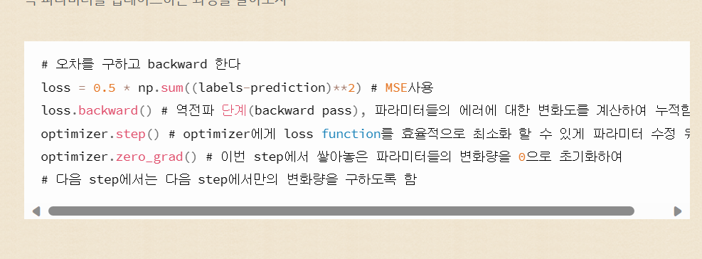배출된 loss 를 backward 시켜라 ( 파라미터 들의 에러에 대한 변화도를 계산하여 누적해라