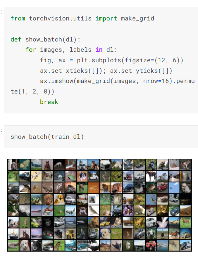 데이터 세트에 있는 배치 이미지를 make_Grid메소드를 이용해서 볼수 있따.