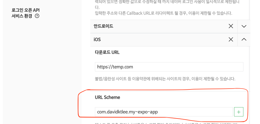 urlScheme은 네이버 개발자 내 애플리케이션에 등록한 ios URL Scheme
