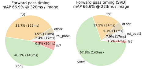 For detection, the processing of a large number of RoIs significantly increases computational demands, with nearly half of the forward pass time spent on the fully connected layers.