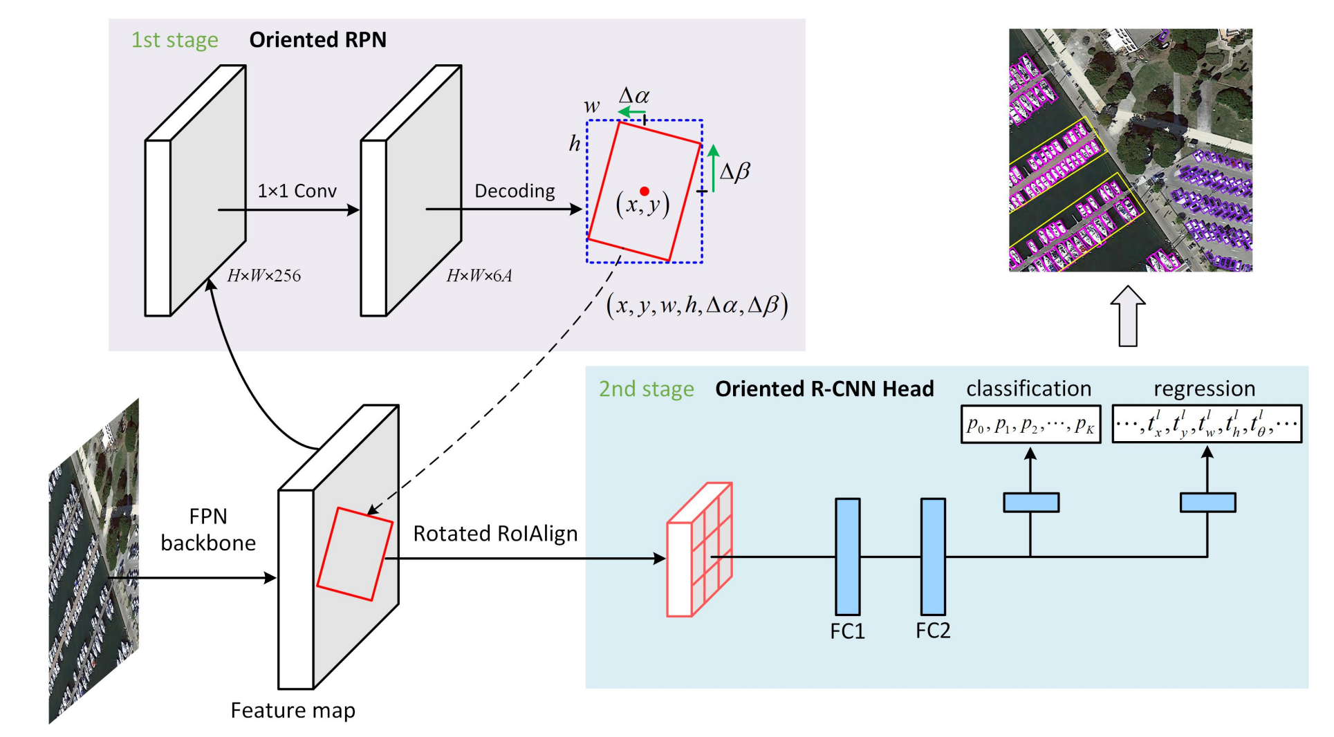 - Rotated RoI Align is applied to capture accurate object features.