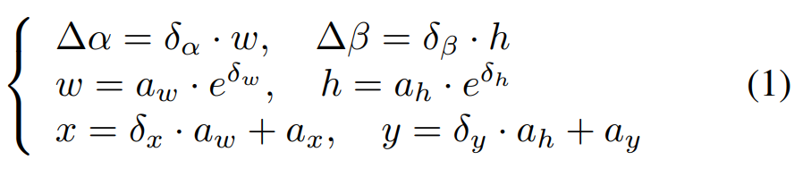 - Regression branch: Outputs bounding-box offsets δ=(δx,δy,δw,δh,δα,δβ)