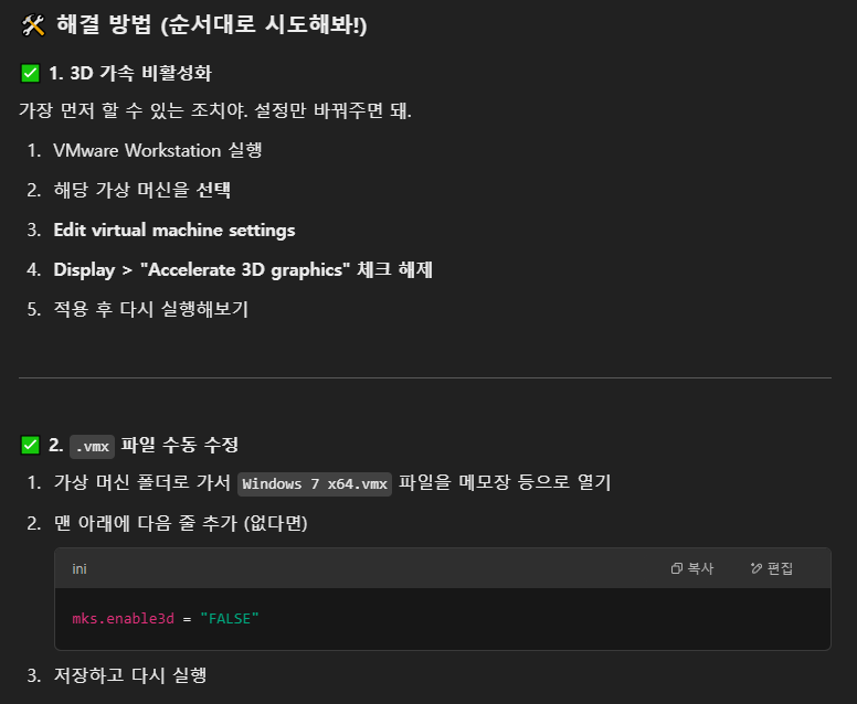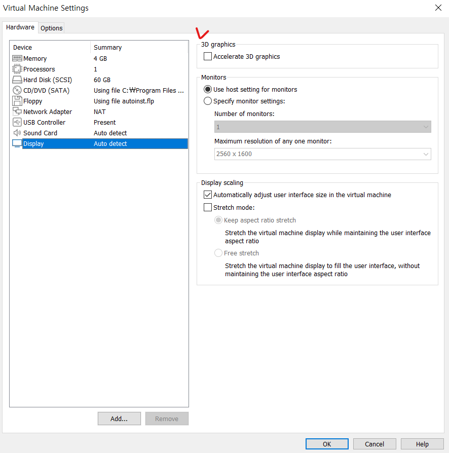 [Edit virtual machine settings] - [Display]에 들어가면 상단의 3D graphics 옵션을 확인할 수 있다. 우선 이를 해제하고, 다시 가상머신을 실행해보았다.