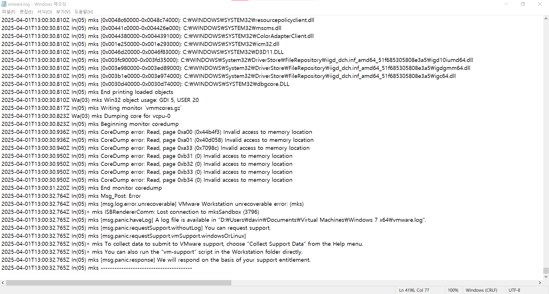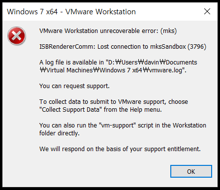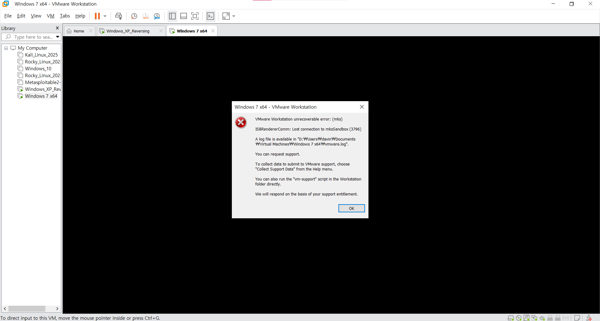 VMware를 켜둔 채로 잠시 나갔다왔는데 갑자기 화면에 이런 에러창이 떴다.