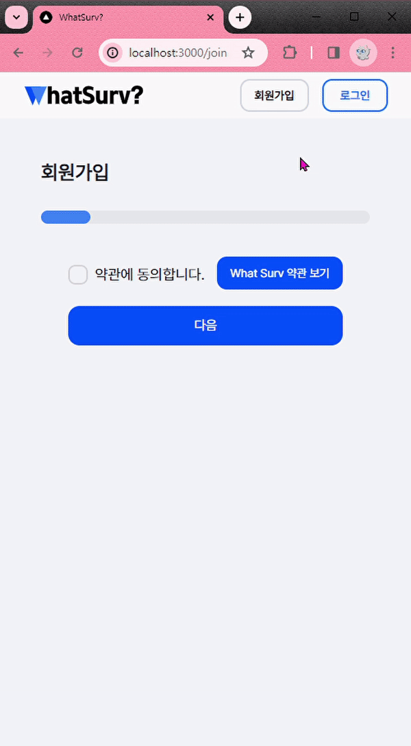 사용자가 약관에 동의하지 않았을 경우, termsCheck 상태를 통해 적절한 경고 메시지를 표시함