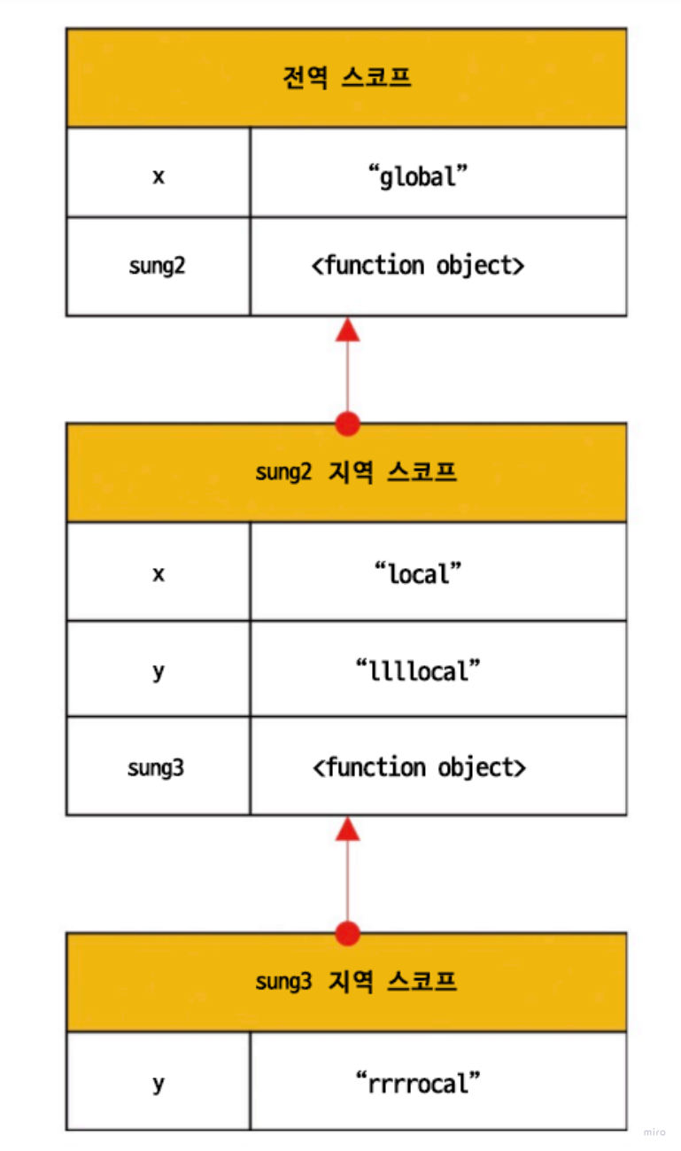 함수는 중첩될 수 있으므로 함수의 지역 스코프도 중첩될 수 있다. 이는 스코프가 함수의 중첩에 의해 계층적 구조를 갖는다는 것을 의미한다. 이때 외부 함수의 지역 스코프를 중첩 함수의 상위 스코프라고 한다.