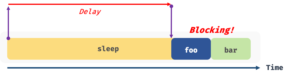 위 예제의 sleep 함수는 3초 후에 foo 함수를 호출한다. 이때 bar 함수는 sleep 함수의 실행이 종료된 이후에 호출되므로 3초 이상(foo 함수의 실행 시간 + 3초) 호출되지 못하고 블로킹(작업 중단)된다.