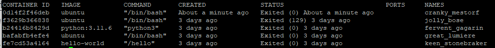 위 명령어를 통해 실행 중인 컨테이너와 정지 상태인 컨테이너 모두를 확인할 수 있다.