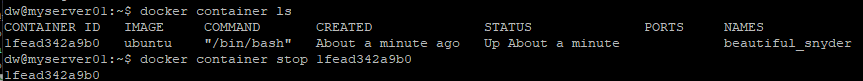 docker container stop [컨테이너 ID]를 사용하여 실행 중인 컨테이너를 종료시킨다.