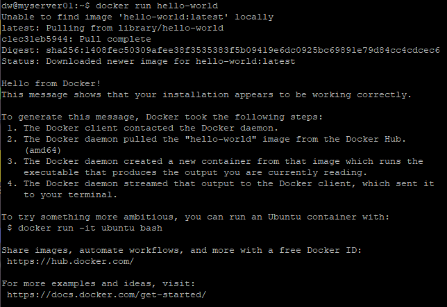 docker run hello-world를 입력하면 위와 같은 출력값을 확인해 볼 수 있다.