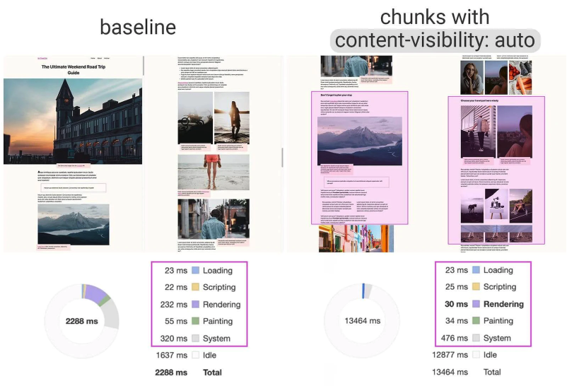이 속성을 통해 user-agent가 필요할 때까지 레이아웃과 그림을 포함한 모든 렌더링 작업을 건너뛰도록 할 수 있다. 컨텐츠가 숨겨져 있거나 화면 밖에 있는 경우 이미지나 iFrames를 포함하는 섹션은 아직 렌더링을 할 필요가 없기 때문에 content-visibility을 활용해서 초기 로드 시간이 빨라 질 수 있다.