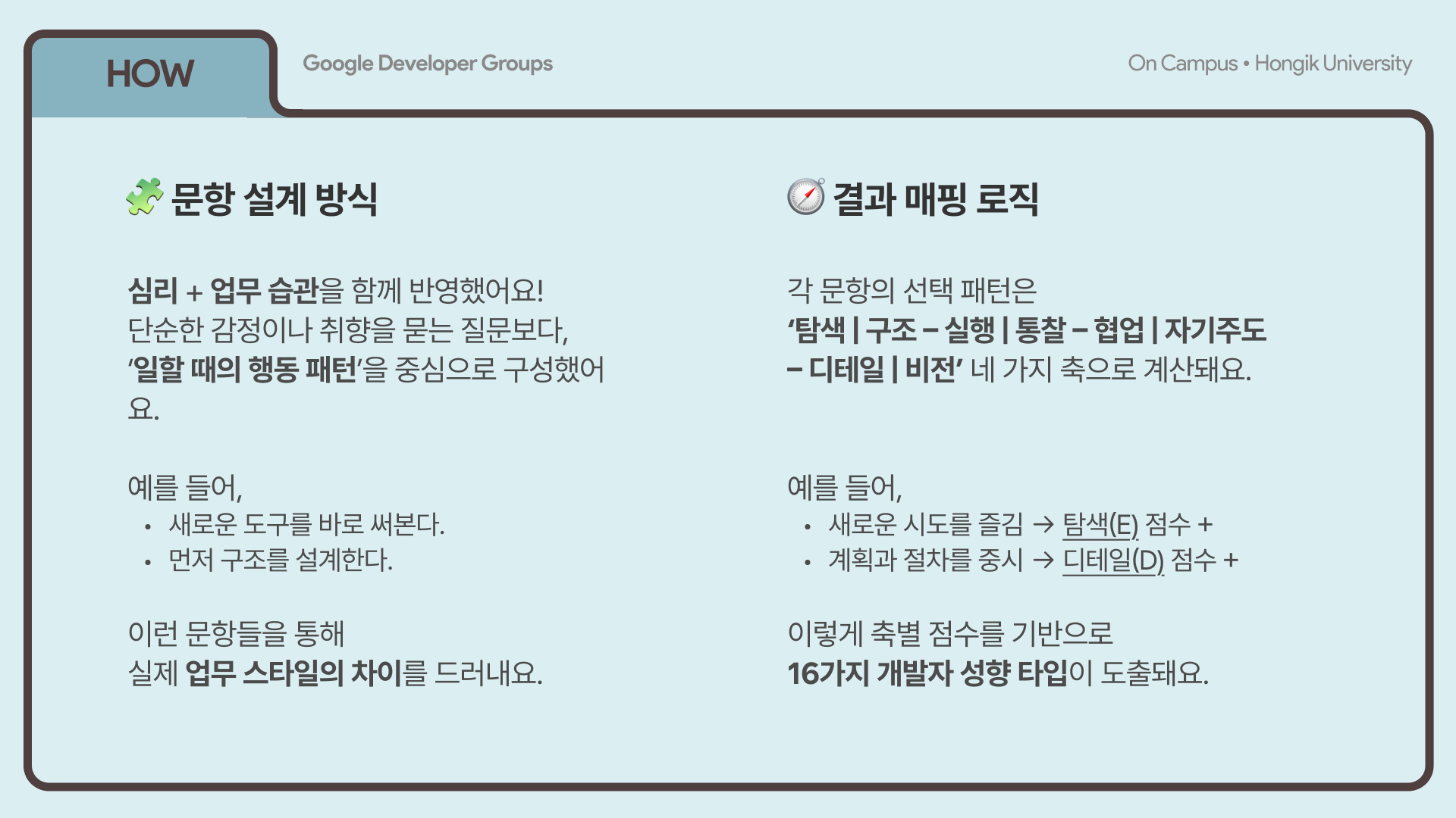 결과 매핑 로직은 앞서 말한 축으로 기준이 되고 그 점수를 기반으로 계산해 총 16가지 개발자 성향 타입이 도출되어요.