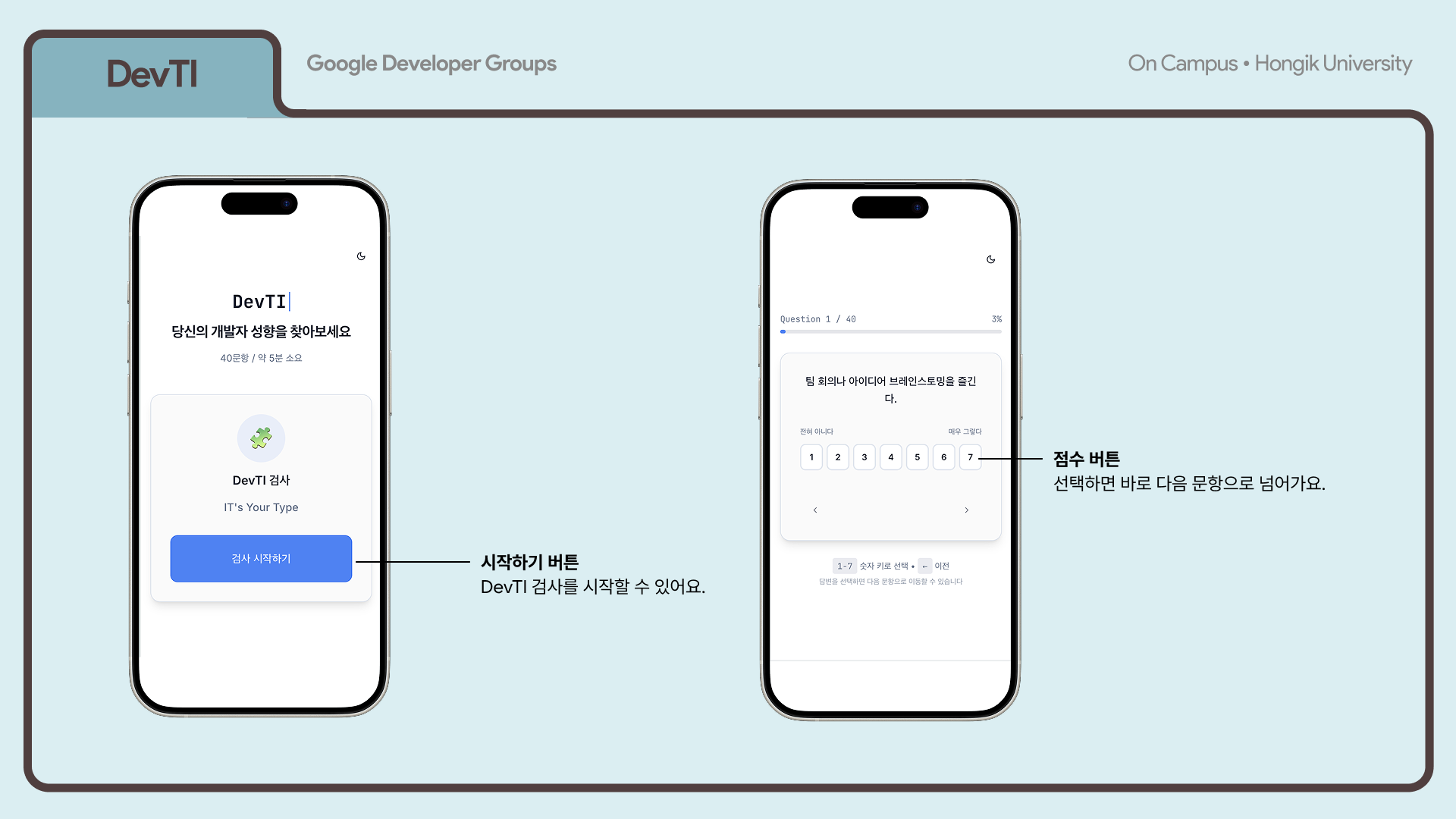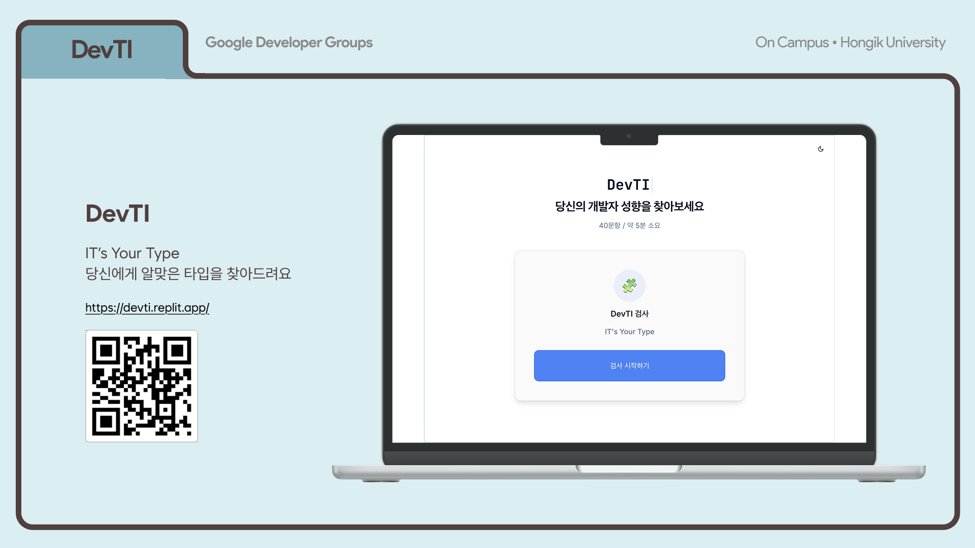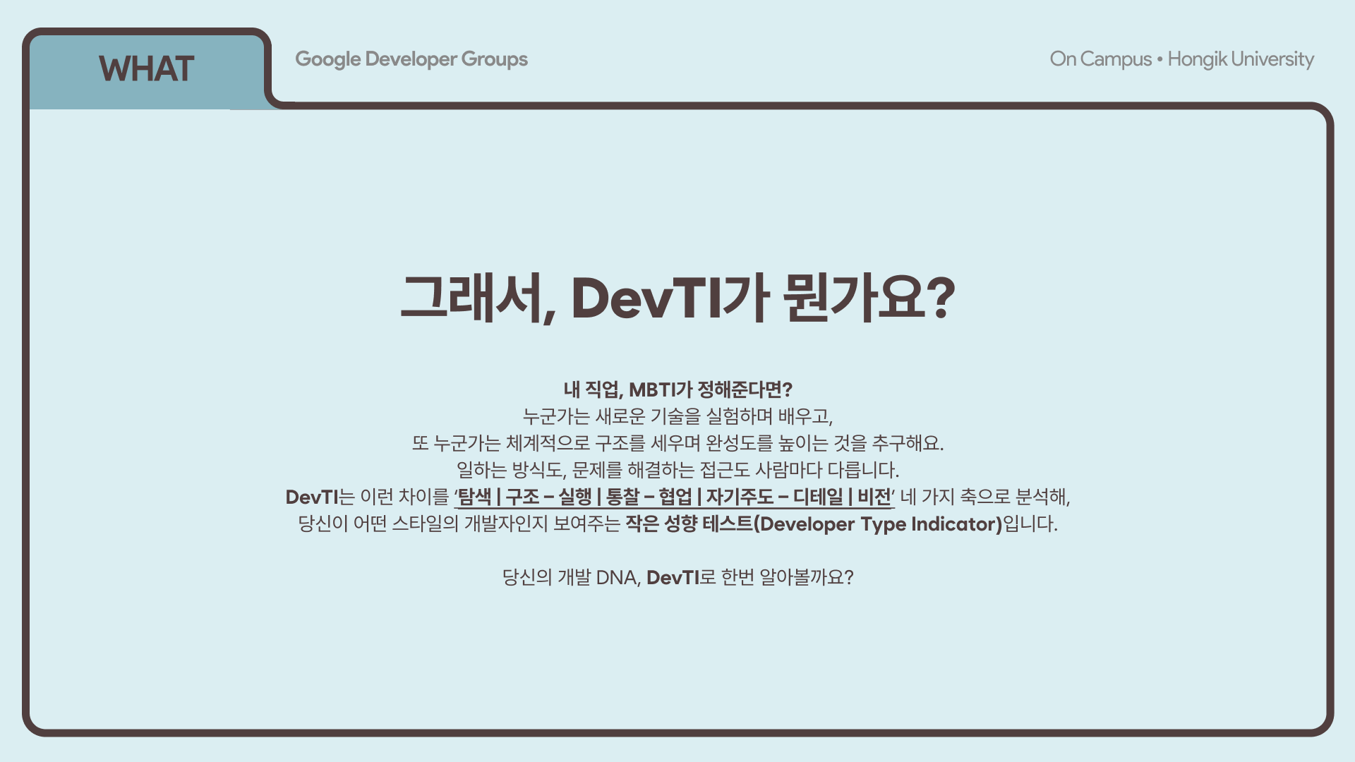 안녕하세요! GDG Hongik의 FE 파트로 세미나에서 발표했던 DevTI: IT’s Your Type에 대해 소개해보려고 합니다.