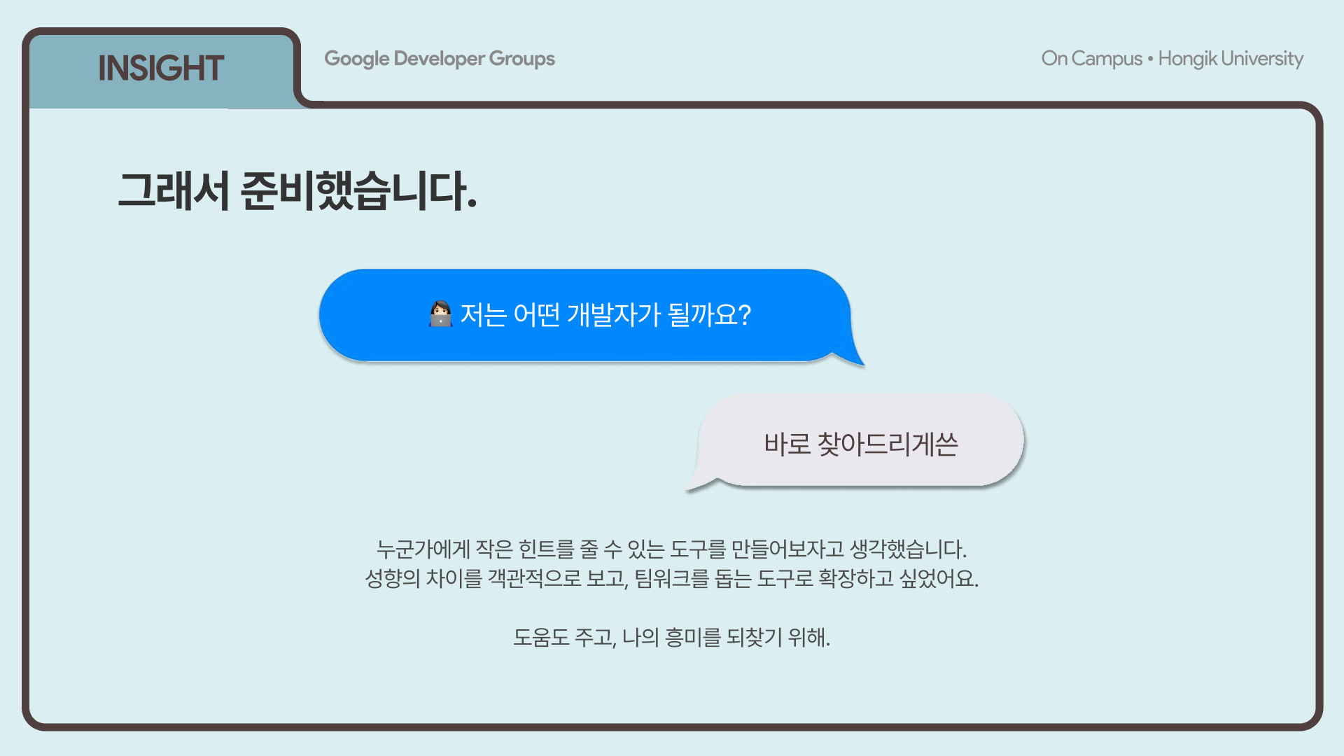 그래서 누군가에게 도움을 줄 수 있는 도구를 기획해보고 싶었습니다! 처음에 어떤 쪽에 흥미가 있는지만 찾으면 그 뒤에 학습하는 데에는 문제가 없다고 생각했거든요. 인터넷에 자료는 무한하니까.