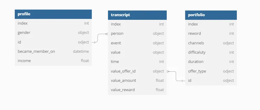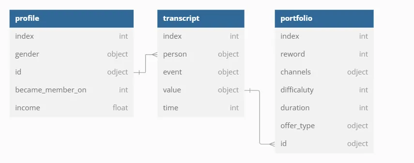 portfolio 테이블, 고객 행동 기록 데이터를 담은 transcript 테이블, 고객 정보를 담은 profile 테이블로 구성