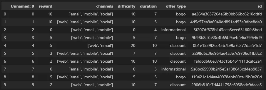 수신 가능한 프로모션 제안에 대한 정보와 각 프로모션의 유형, 프로모션 기간, 보상 그리고 해당 프로모션이 고객에게 어떻게 배포 되었는지에 대한 기본 정보