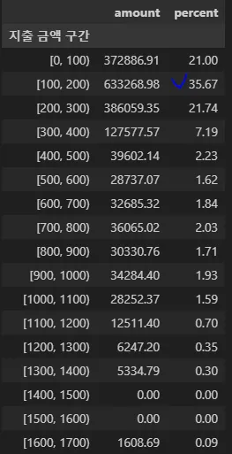 customer_amount['지출 금액 구간'] = pd.cut(customer_amount['amount'], bins=range(0, int(customer_amount['amount'].max())+ 100, 100), right=False)