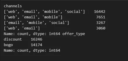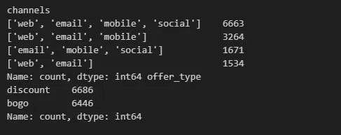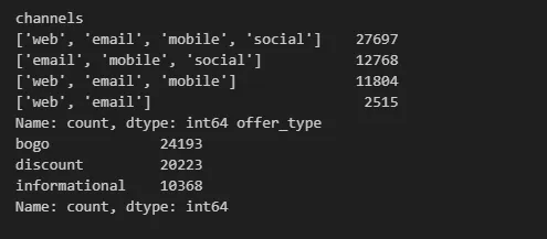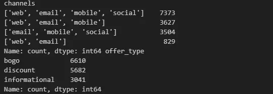 print(promotion_view['channels'].value_counts(), promotion_view['offer_type'].value_counts())