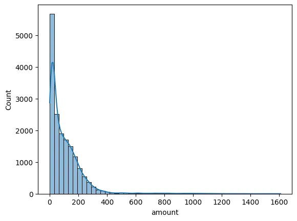 sns.histplot(data = customer_amount, x = 'amount', bins = 50, kde=True)
